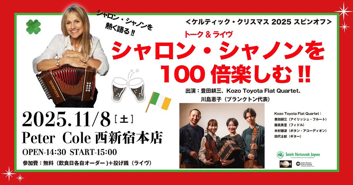 トーク&ライヴ「シャロン・シャノンを100倍楽しむ!!」 2025年11月8日(土)14:30開場/15:00開演 アイリッシュパブピーターコール 西新宿本店 1部:15:00トーク/2部:16:00ライヴ